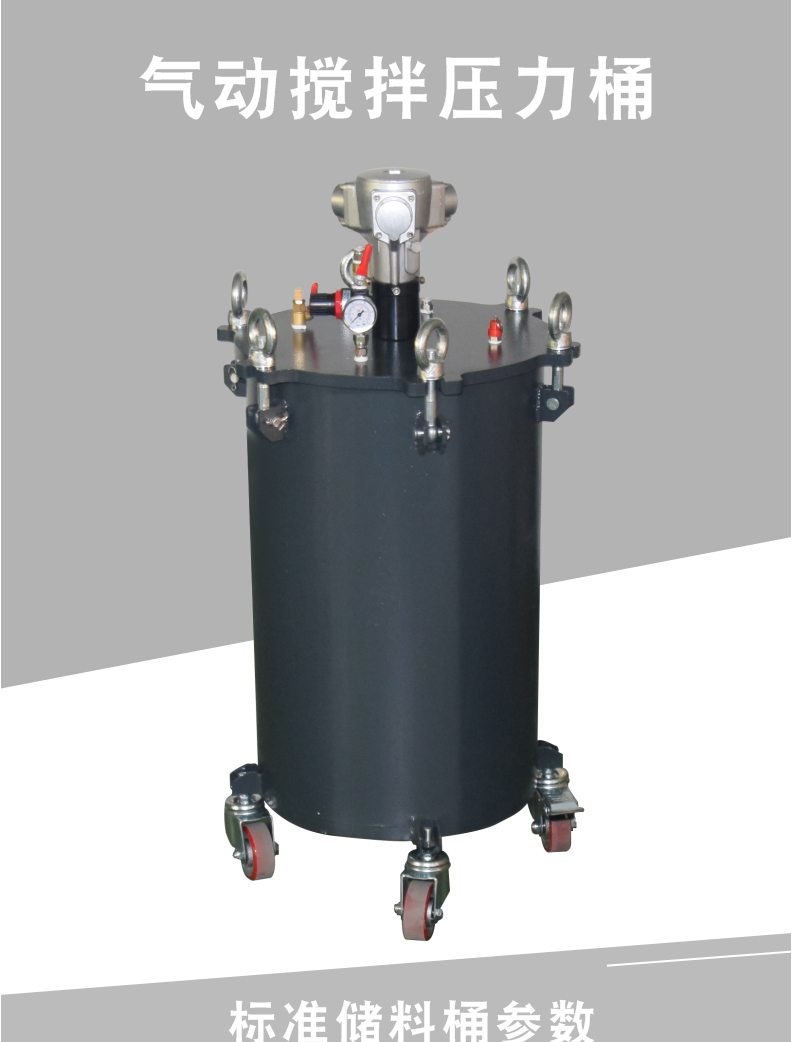 气动压力桶搅拌型,在标准压力桶的基础上,增加了气动搅拌功能,同时又增加了4个万向轮子。